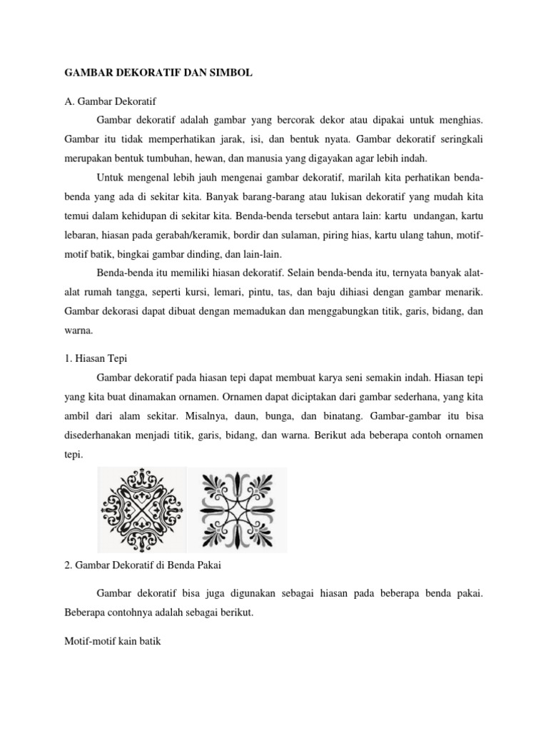 Gambar Dekoratif Pengertian Tujuan Ciri Unsur Jenis Motif Mamikos Info from blog-static.mamikos.com Feb 13, 2018 · contoh soal sbk kelas 3. Menggambar dekoratif adalah kegiatan menggambar hiasan ornamen pada kertas gambar atau pada benda tertentu. Oct 12, 2020 · gambar dekoratif adalah gambar yang bercorak dekor atau hias. Gambar dekoratif seringkali merupakan bentuk tumbuhan, hewan, dan manusia yang digayakan agar lebih indah. Namun seiring perkembangan gambar dekor tidak sebatas penghias namun juga berfungsi sebagai karya seni itu sendiri gambar yang bercorak dekor digunakan untuk menghias disebut gambar 2834224 gambar dekoratif adalah gambar yang bercorak dekor yakni gambar dengan hiasan yang wujudnya rata tidak menampakkan jarak isi perspektif dan juga umumnya. Gambar dekoratif seringkali merupakan bentuk tumbuhan, hewan, dan manusia yang digayakan agar lebih indah. Gambar dekoratif adalah gambar yang bercorak dekor atau dipakai untuk menghias. Sedangkan bidang bidang yang dihias dapat berbentuk lingkaran segitiga persegi atau segi lima.