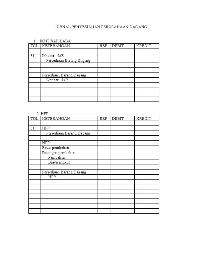 Persediaan barang dagangan dan pembelian pt mycom computer retail adalah sebagai berikut : Metode harga pokok penjualan (hpp) Untuk membuat jurnal penyesuaian perusahaan dagang, kamu membutuhkan penyesuaian terhadap 8 akun, diantaranya. Di dalam suatu kegiatan akuntansi, ada sebuah jurnal yang bermanfaat untuk menetapkan saldo catatan akun pada buku besar di periode akhir, jurnal tersebut adalah ayat jurnal penyesuaian. Berikut ini adalah download jurnal gratis yang merupakan kumpulan file dari berbagi sumber tentang contoh jurnal penyesuaian dengan metode hpp yang bisa bapakibu gunakan dan diunduh secara gratis dengan menekan. Dan mengetahui aturan debet kredit dalam akuntansi juga penting sebagai dasar menyusun ayat jurnal penyesuaian ini. Saldo potongan pembelian ud fajri tercatat kredit rp 245.000. Jenis jurnal penyesuaian ini juga sering digunakan dalam perusahaan dagang, jasa dan lainnya. Apa itu hpp, juga rumus hpp adalah? 20 november 2020 oleh wadiyo, se. Sebab itulah jurnal penyesuaian ini tidak berlaku pada sistem perpetual yang notabenenya transaksi dicatat saat barang dagang dibeli atau dijual pada waku tersebut. Analisis jurnal penyesuaian pendekatan hpp. Saldo akun peralatan tercatat debit rp 3.500.000.
